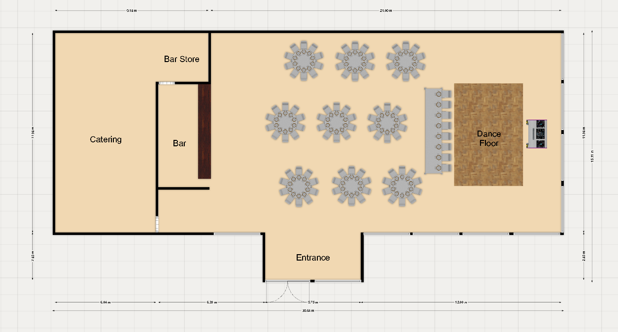 The main focal point for the wedding breakfast and for socialising during the afternoons celebrations. This area will be furnished with all of the furniture for the sit down meal and will not only need to be larger enough for guests to comfortably enjoy themselves, but also have enough space for the serving staff to perform their duties effectively.